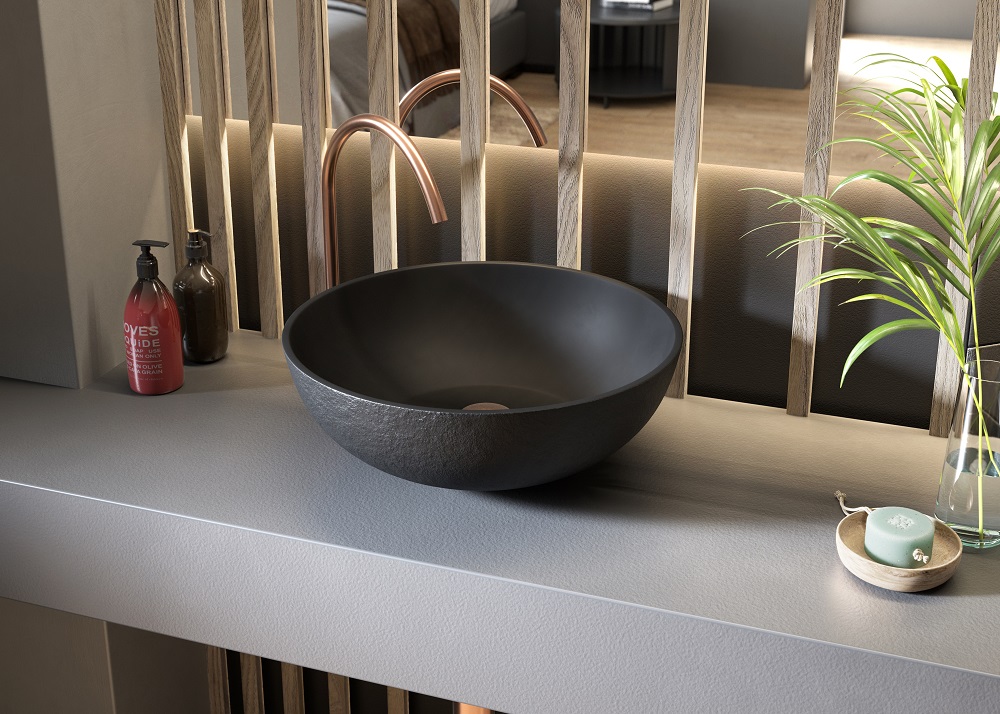 The new X-large countertop basins are created in Acquabella’s unique material, Akron available in a choice of textures and 2000 colours.
