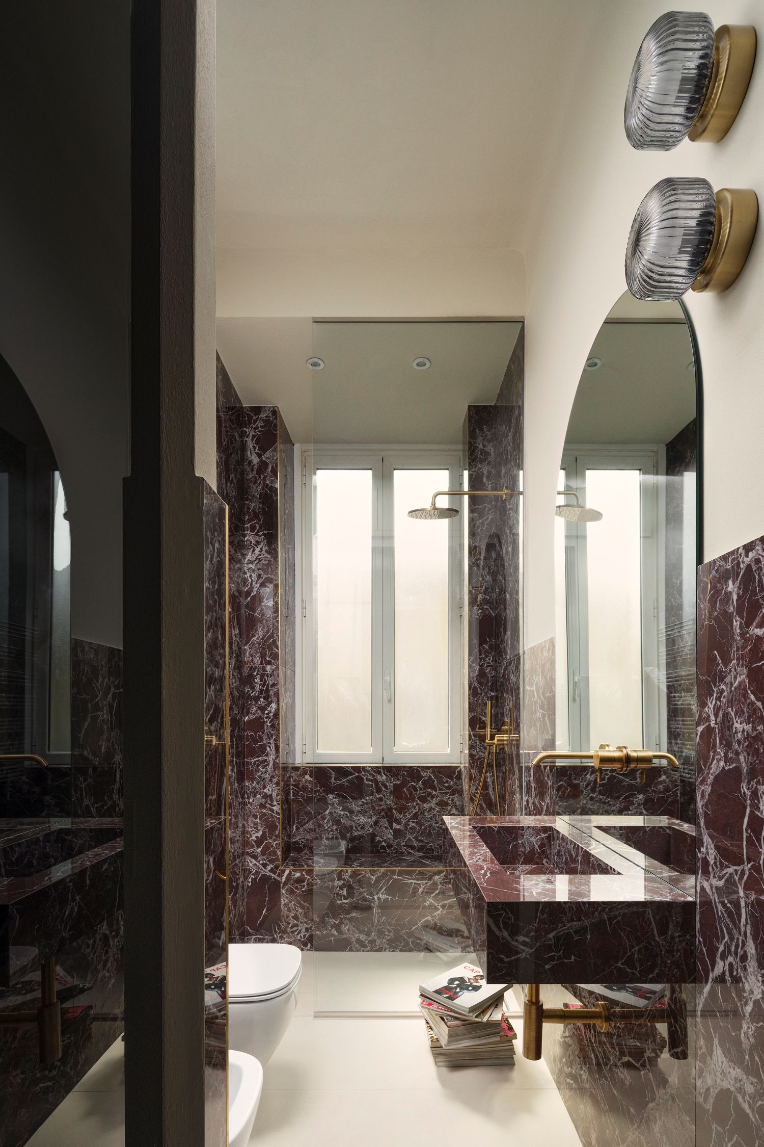 One of the home’s standout features is its multi-functional porthole within the open-plan kitchen and living area – a bold symbol of the way contemporary Milanese life blurs boundaries between rest, work, and social interaction. Adjacent to this, a transitional walk-in wardrobe subtly separates the public and private zones, guiding occupants into a bedroom retreat. Meanwhile, the bathroom, enveloped in a cloak of imperial red, becomes a centrepiece of opulence and calm.
