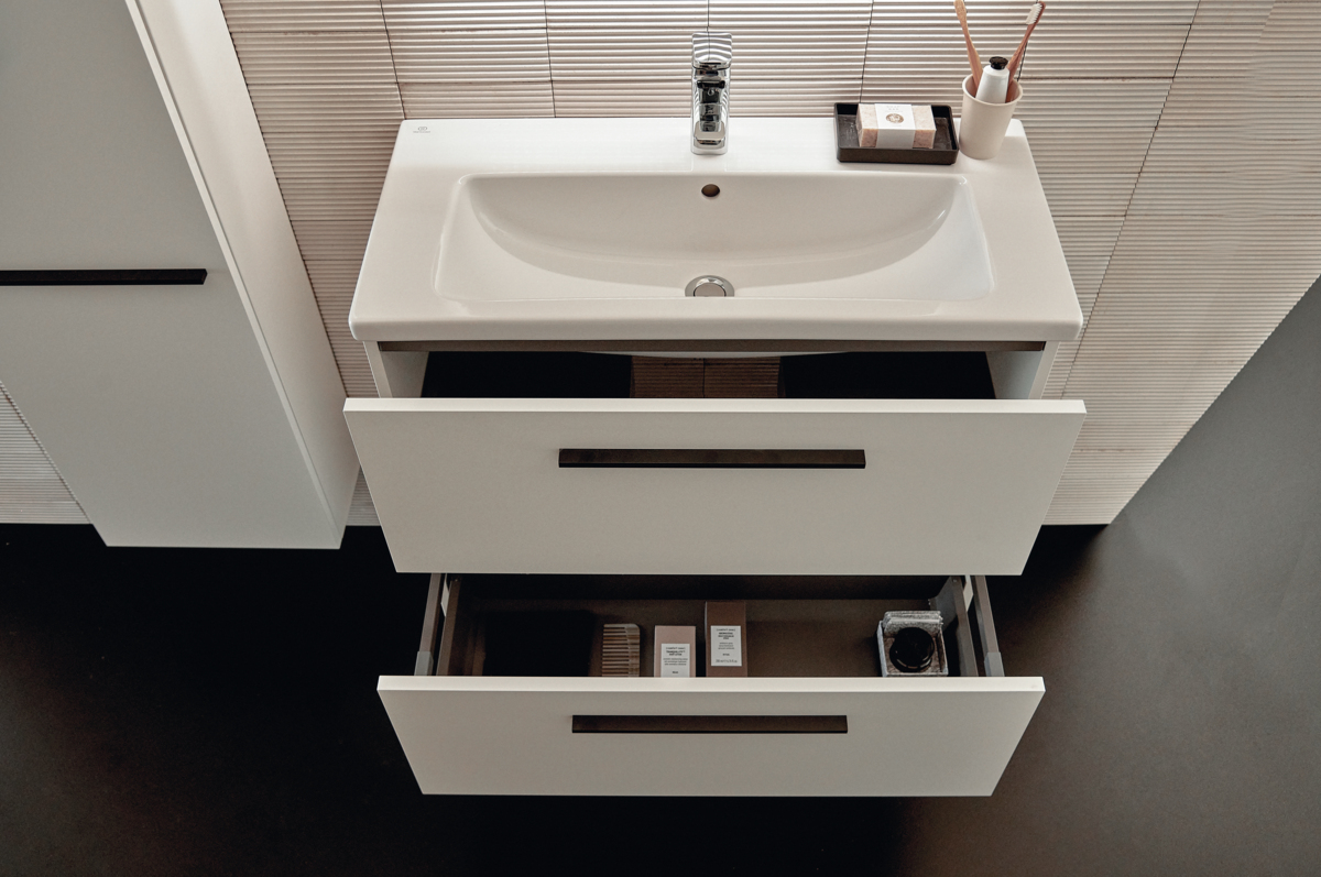 Creating space with wall-mounted vanity units and integral basins frees up floor space and delivers storage options. Pictured top, Ideal Standard’s i.life Collection includes various furniture options in seven stylish finishes, such as sand beige matt, carbon grey matt and natural oak, as well as chrome and silk black handles to match your brassware. The i.life S is specifically designed to fit into smaller spaces to take up as little floor space as possible but still provide reasonable levels of functionality.