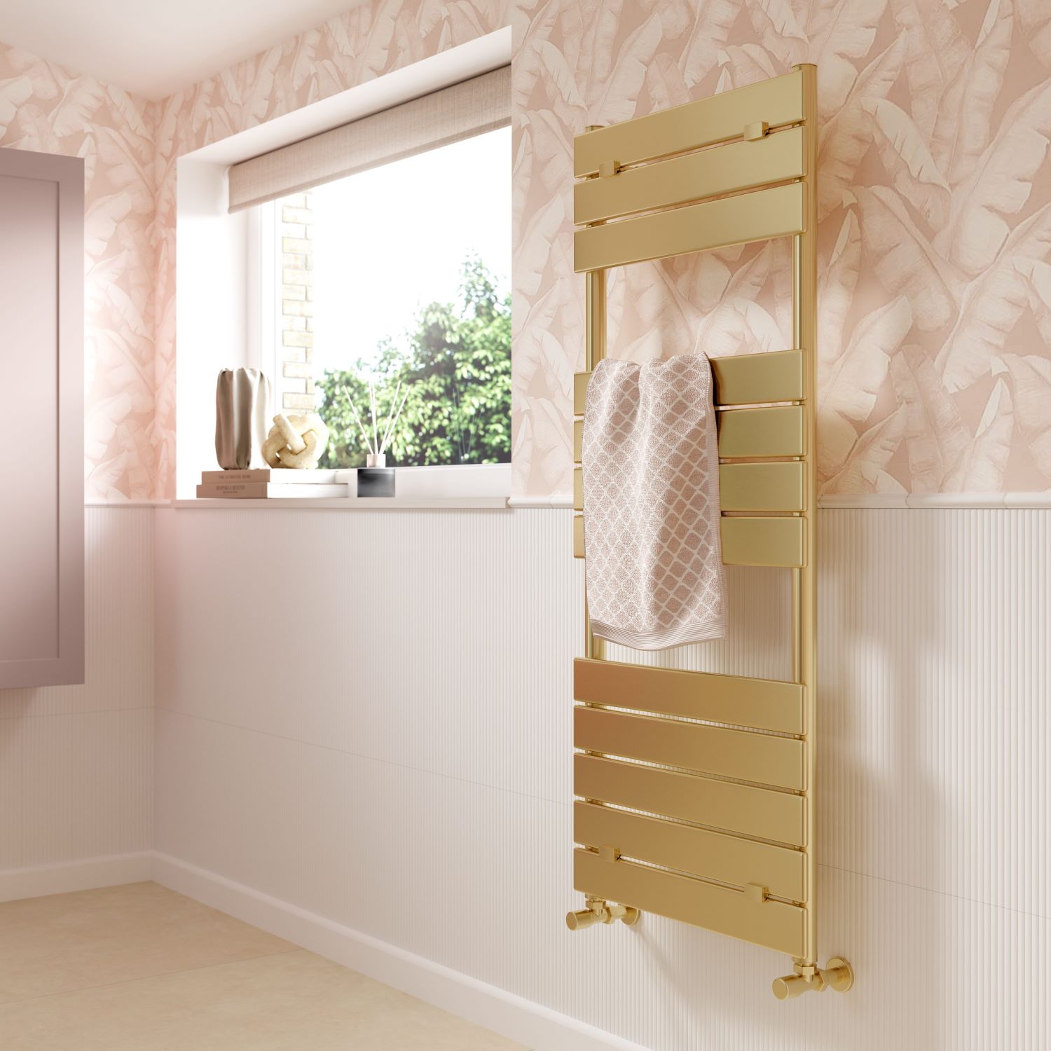 Available in three finishes: brushed brass, matt black, and chrome, the TREND radiator family boasts a contemporary square design with flattened, slim bars for an ultra-smooth look. Available in a width of 500mm, three models measure in at heights of 840, 1200, and 1500mm, providing a good choice for differing bathroom sizes. Depending on size and finish, heat outputs range from 1099 to 3061 BTUs.