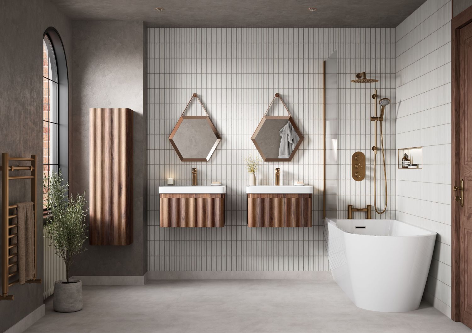 Bathrooms to Love offers a comprehensive range of coordinating products that can team up with Kuba Walnut for a fully cohesive bathroom design – in particular, matching metallics, such as the Brushed Bronze taps, mirrors, radiator, shower, screen and overflow rings as pictured.