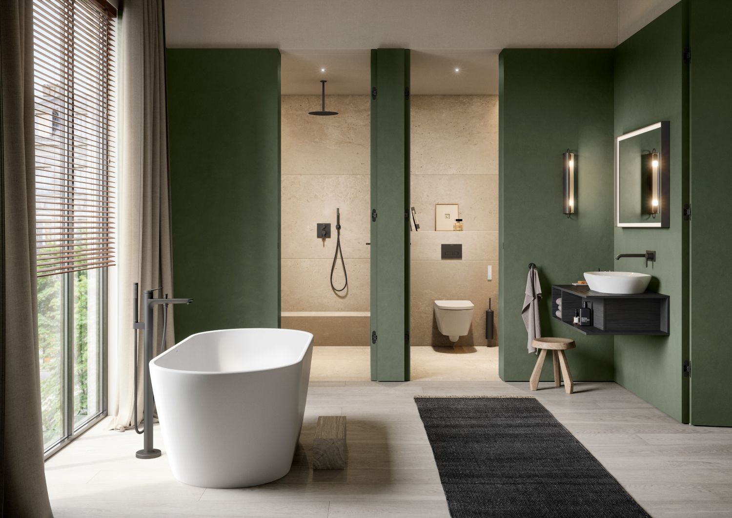 Embracing the growing trend of bathrooms as personal sanctuaries, Lejoly combines open space with intimate design elements. The muted moss-green walls complement carefully selected materials, enhancing the room’s inviting, homely feel.