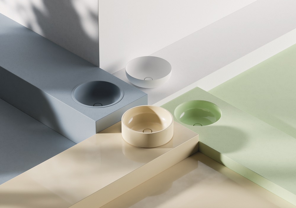 The undermounted and built-in washbasins are the classics for installation in bathroom furniture, with the slender rim created in only the thickness of the material itself. A cylindrical countertop washbasin and a washbasin bowl complete the range. This system of creating four variants from one bowl shape reduces manufacturing costs – and means the washbasins can be priced competitively compared to other materials.