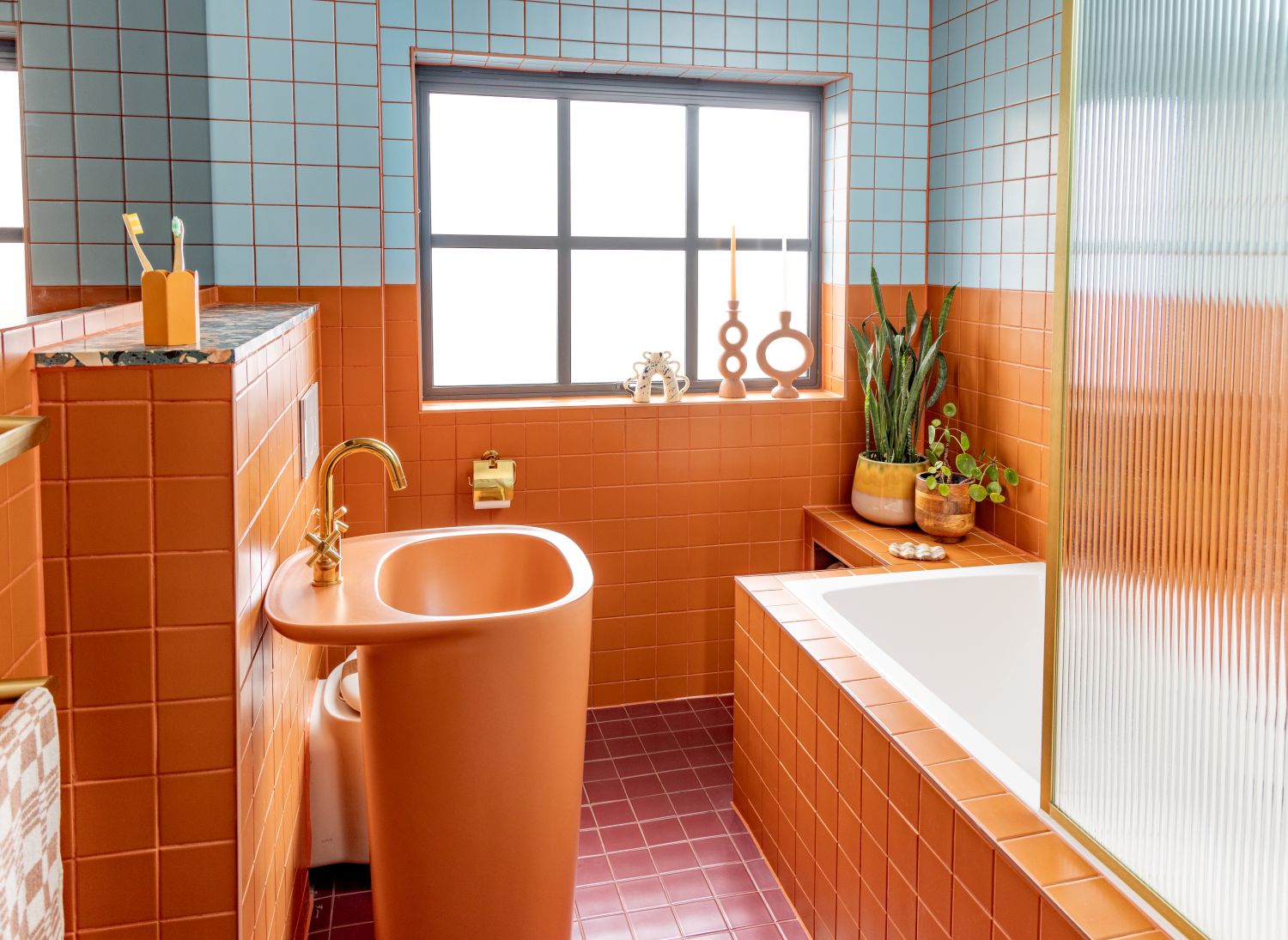 Main Image Top – The Plural washbasin by Terri Pecora for VitrA are matched with VitrA Pro Colour range tiles in terracotta and blue and gold Origin fixtures and fittings for a striking look. Photographer: Sam Roberts