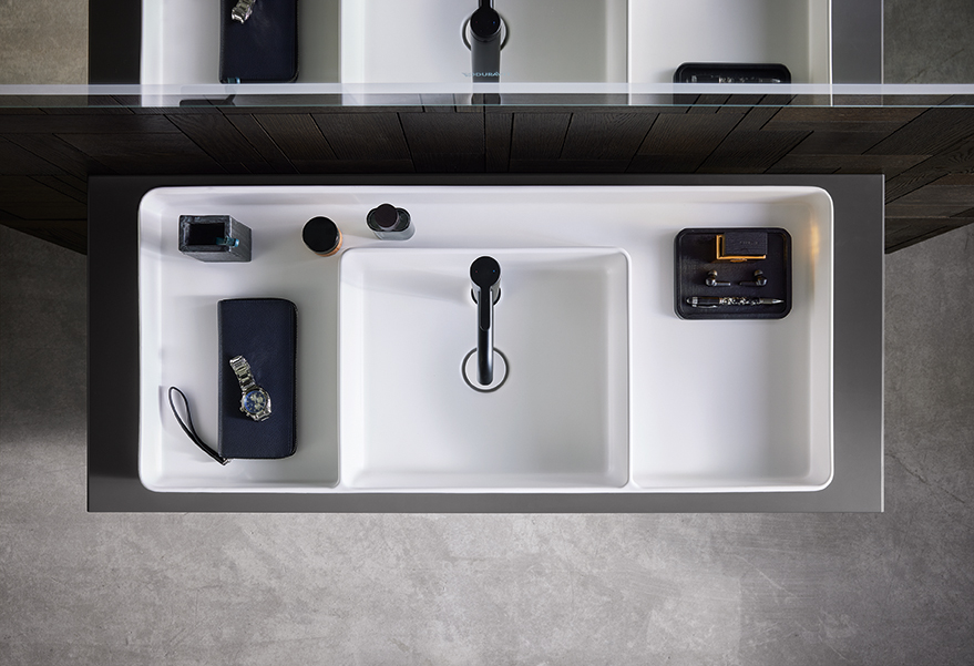 The Bento Starck Box single washbasins are made from DuraCeram®, and the double washbasins from DuroCast UltraResist. Enabling Duravit to demonstrate how a range of different materials can be used to produce unconventional designs.
