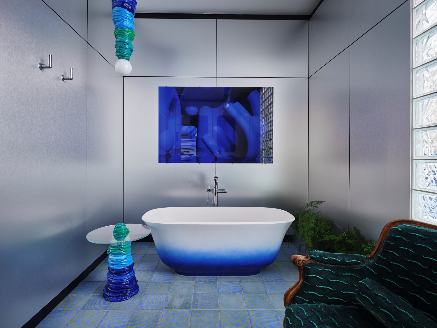 In the spirit of the exhibition, Jordan and Russell have brought in other designers and artists to produce a bathroom that is a true one-off. Central to the design are bathroom fittings from Victoria + Albert, who supplied the bath and basins, and Riobel, who provided the brassware.