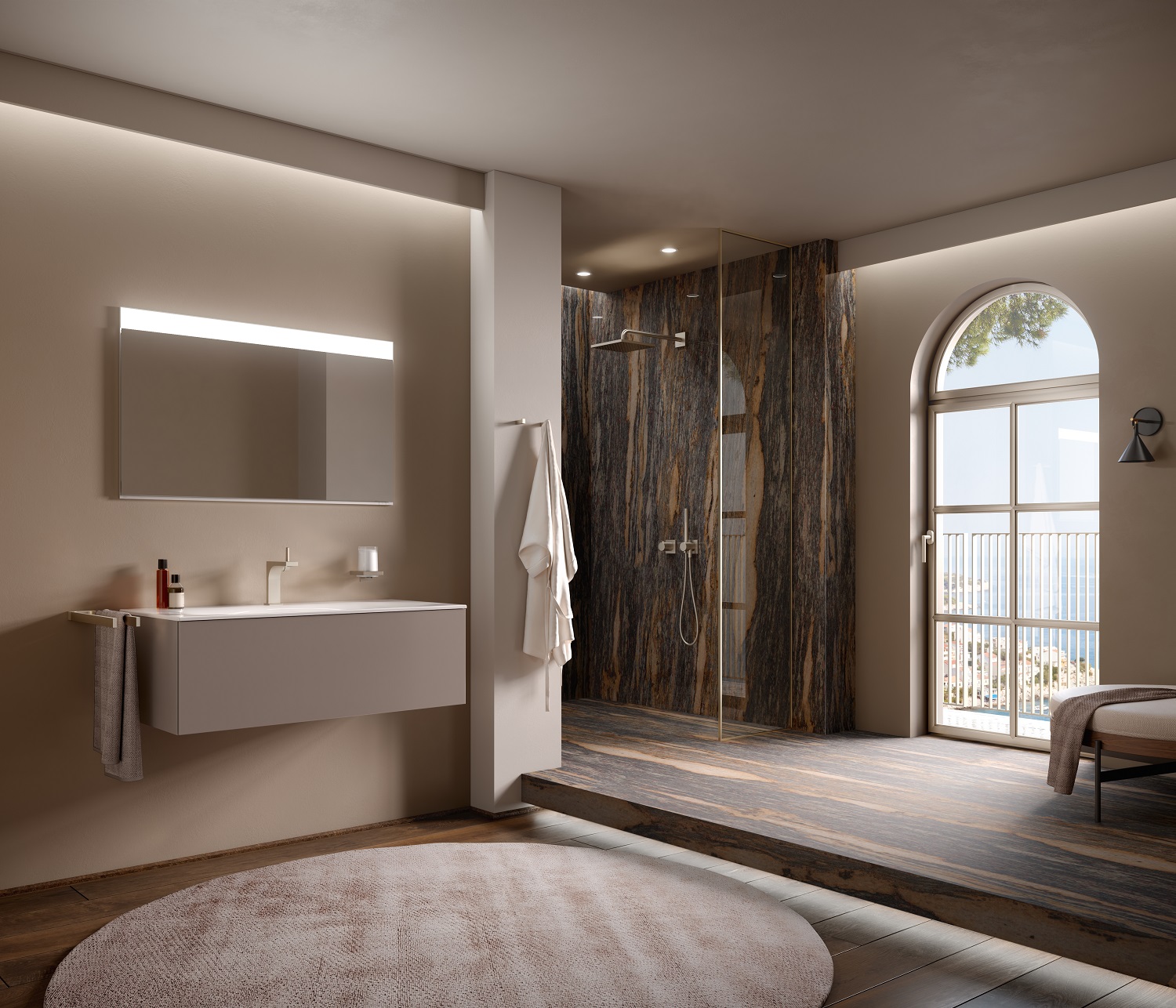 The cover plate can be combined in round or square for all three designs, matching the IXMO mixers in the shower and on the bathtub.