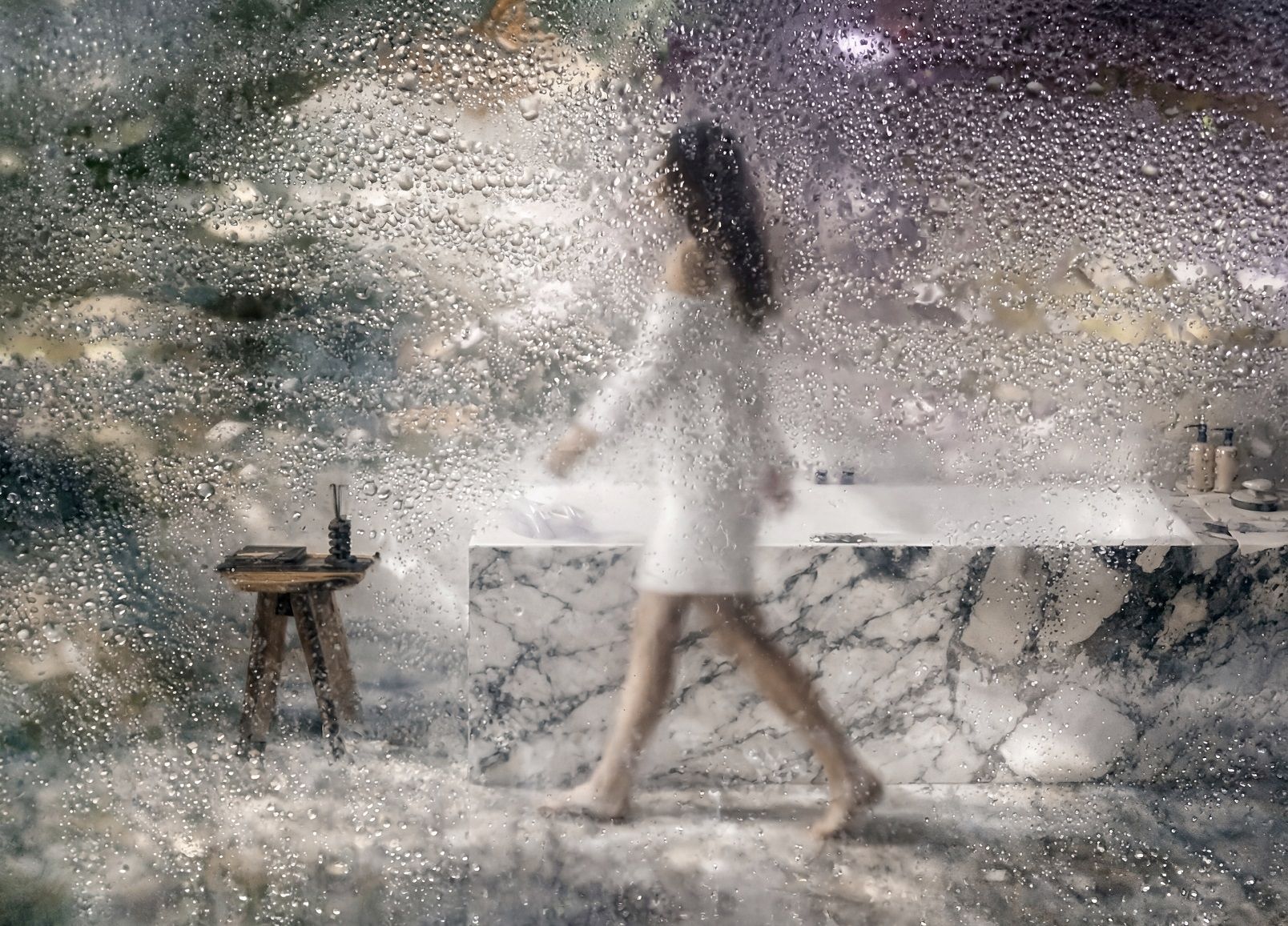A central feature of the installation is a reinterpretation of the Meisterstück Classic Duo Oval, one of Kaldewei’s most recognisable freestanding bathtubs. Presented within a theatrical setting of floating forms, light and reflections, the products appear as fleeting moments within a continuous flow of time.