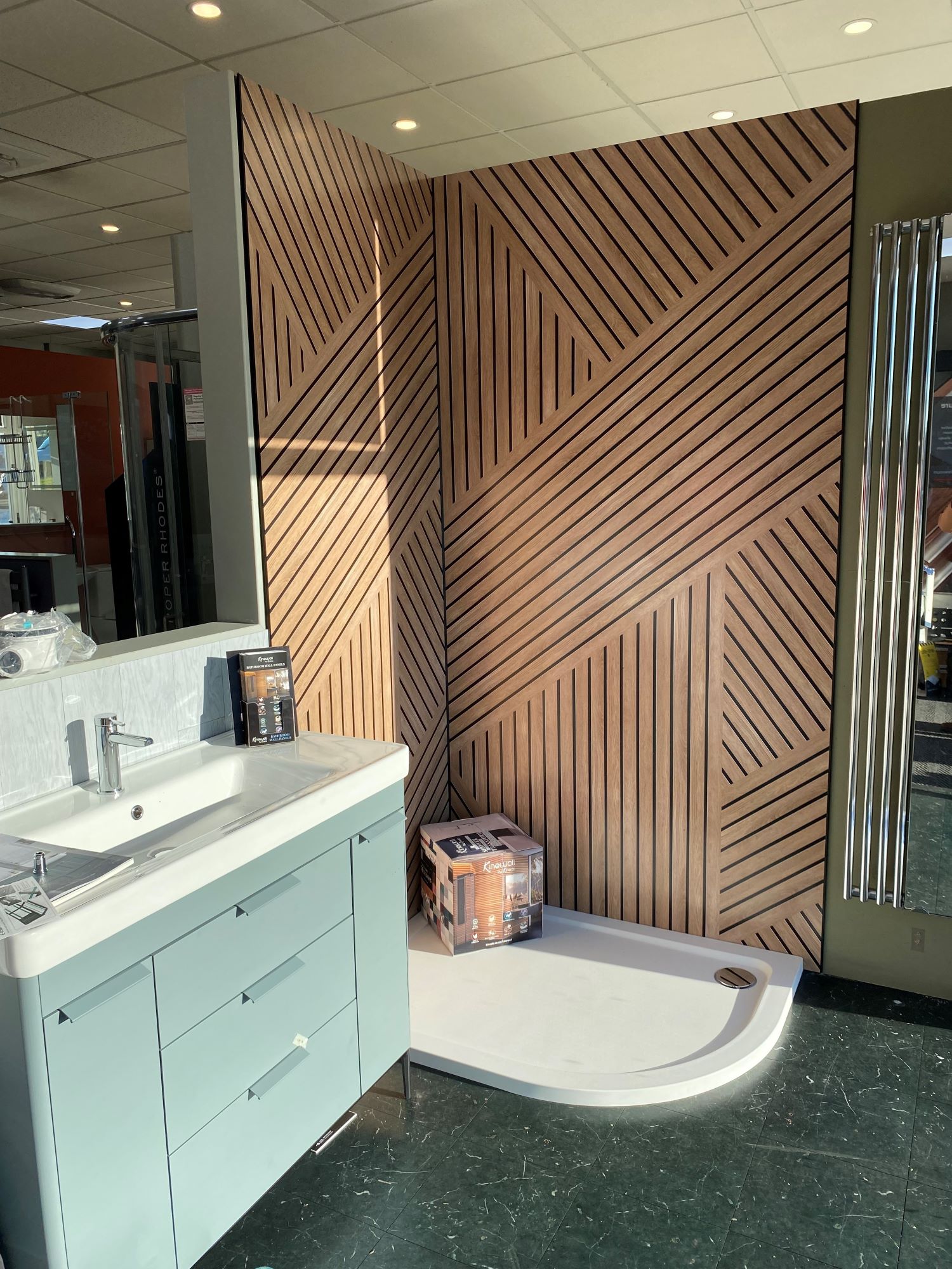 To enhance the in-store and showroom experience, the team from Kinedo has produced a comprehensive package of display items, including posters, leaflets and dispensers, cube displays, strut cards, wobblers, floor stickers, window stickers, floor mats, wall boards, swatches and totems. These materials showcase the diverse patterns, styles, and colours of Kinewall panels, whilst the actual showroom displays of Kinewall offer the opportunity to feel and touch the quality of the panels themselves.