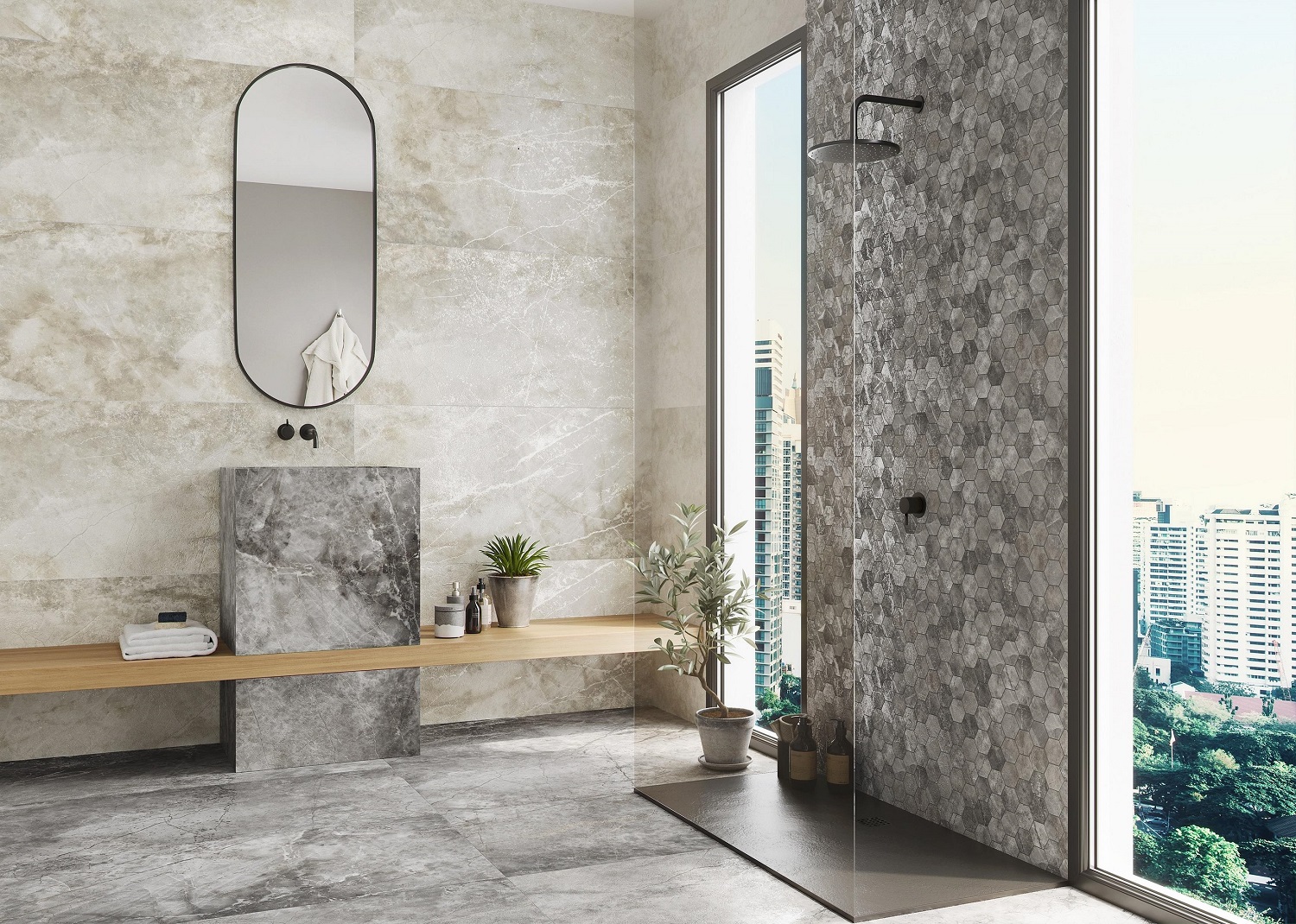 The Nagoya tile, Ceramique Internationale’s dramatic new addition to its large format porcelain tile collection, is highly durable, making it ideal for bathroom walls and floors. It is available in four colours, from classic grey and graphite to eye-catching marfil and greige.