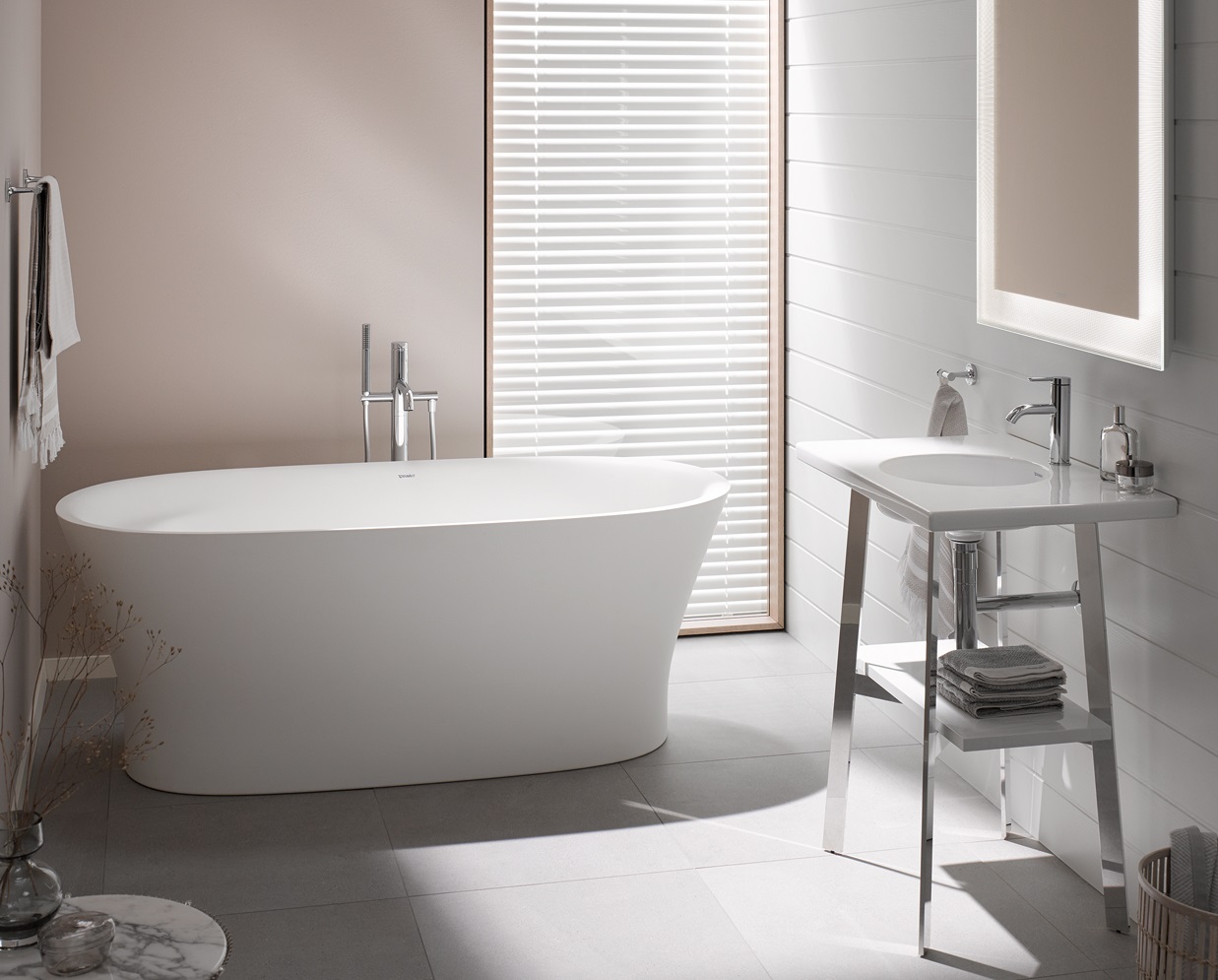 The feel-good atmosphere in the compact bathroom can be further enhanced with the strategic positioning of bathroom embellishments, accessories, and plants as well as the interplay of welcoming light sources.