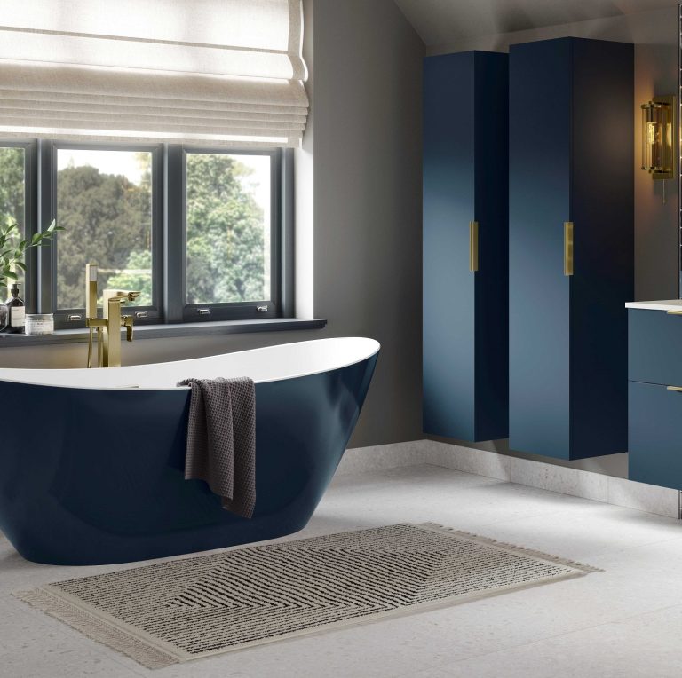 With the trend for inky blue indigo’s and navy themed bathroom colour schemes showing no sign of fading, this bold Matt Blue bath tub finish is a welcome addition to Belmont’s other colour options of grey and white. Designed to stand-alone or to coordinate perfectly with many of the furniture ranges within the Bathrooms to Love Collection, it is shown here teamed with modular furniture range, ‘Statement’ in Matt Deep Blue and the ‘Luxey’ washbowl, also in Deep Blue. Brushed brass taps and accessories complete the decadent look, and customers can opt for either a free-standing bath shower mixer, as shown, or wall-mounted bathing brassware.