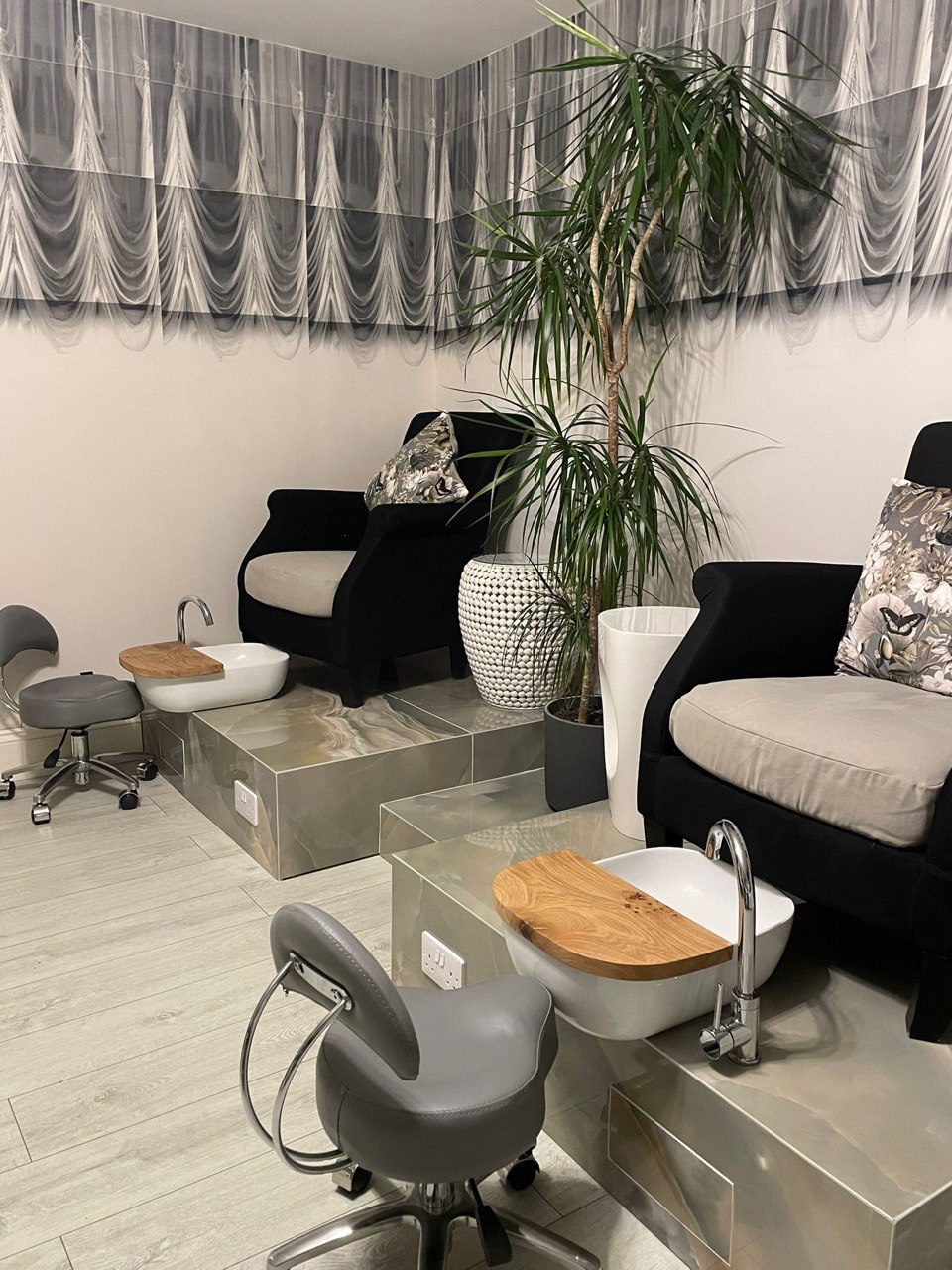 Adam McEwan of Sussex Wetrooms explains, “We were tasked with designing and building these beautiful pedicure thrones for a treatment room. They not only needed to be aesthetically pleasing but also functional so that the technicians could work at a comfortable height whilst having space for their equipment. We created a solid timber framework clad in marine ply then covered it with Schlüter-DITRA and Schlüter-KERDI-200 waterproofing membrane; it was all then finished with a large-format, green onyx porcelain tile. All external edges were mitred and finished with a gloss resin colour-matched to suit the tile. Along with installing the basins and mixer taps, we also the Schlüter-REMA system to create a concealed access panel to ensure the taps and basin wastes were accessible for servicing in the future.”