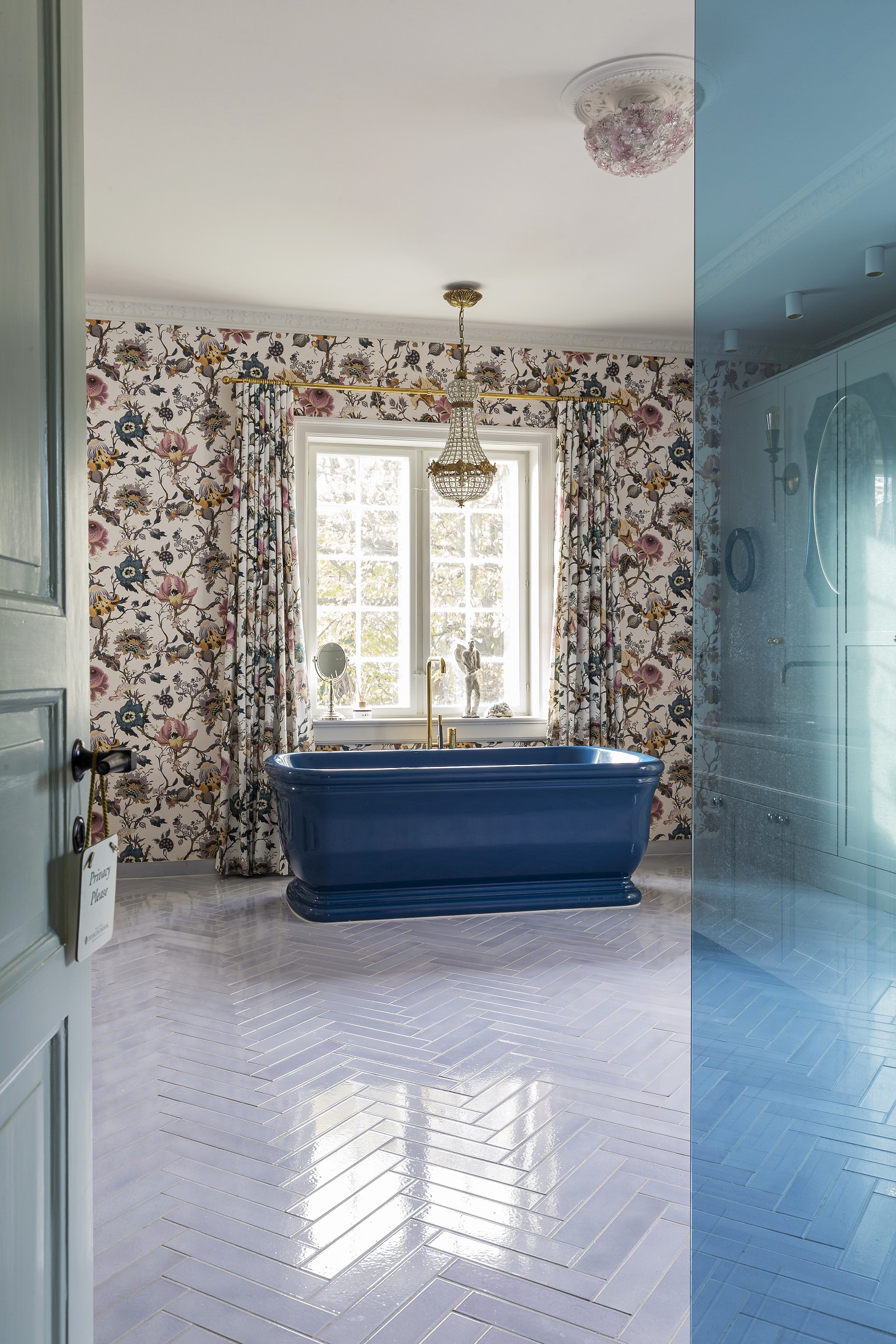 This stunning space is everything they wanted, from the large blue freestanding bathtub, lavender-coloured floor tiles, imposing chandelier, pink sofa, and floral wallpaper to matching curtains. The colour palette and furnishings in the room are all brought into harmonious alignment with the stylish curation of their own beautiful vintage accessories and the well-executed brass detailing.